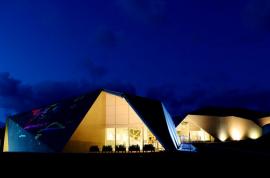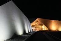 川棚温泉のど真ん中に建つ川棚の杜コルトーホールは、三角形を組み合せた多面体の不思議なカタチの建物。その設計は、2020年東京オリンピックスタジアムを手がける建築家隈研吾氏によるもの。期間中は、建物のライトアップと山頭火俳句のプロジェクションマッピング。