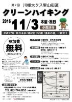 第2回川棚大クス里山街道クリーンハイキング11月3日(木・祝)集合場所:川棚の杜まちなか広場スタート受付時間:9時30分~10時ゴール受付時間:12時~14時川棚温泉とクスの森をつなぐ中国自然歩道でクリーンハイキング。スタート受付でゴミ袋を受け取ったら随時スタート。折り返し(昼休憩)のクスの森では地元野菜やしし汁の販売も。ゴールでは、集めたゴミと引きかえにガラポン抽選会。往復10キロ。持物に昼弁当、飲物、雨具、軍手をお忘れなく。お問い合わせ 川棚温泉観光ボランティアガイドの会 電話083-774-3855