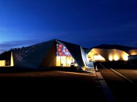 三角形を組み合せた多面体の不思議なカタチの建物、川棚の杜・コルトーホールを灯かりとプロジェクションアートでライトアップします。